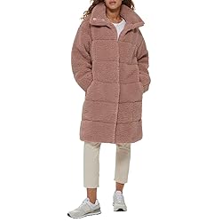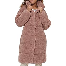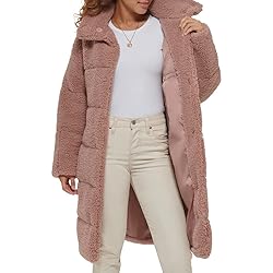 Stylish Design: Long sherpa jacket provides added warmth and style with all over sherpa fabric and quilted exterior design Functional Details: Teddy coat features two lower pockets for convenient storage Easy to Style: Long length and versatile design make this quilted sherpa easy to pair with different outfits Secure Closure: Snap button closure offers protection from the elements. Sizing Info: Model is wearing a size medium