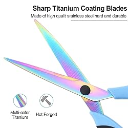Premium material: The blades of scissors are made of high strength stainless steel, anti-rust and durable for use, with 3x hardness of common stainless steel and stays sharper longer Titanium coating: Blades with iridescent titanium coating are excellent in anti-corrosion performance, quite capable for resisting adhesion like glue and tape, suitable for almost all kinds of tasks Comfortable to use: Soft ergonomically designed handle made of high-quality ABS material, wrapped with semi-soft rubber on the inner ring for a comfortable grip. The blue easy-grip design ensures a secure hold and precise control. Both right and left-handed users can experience comfortable handling during use Wide rang of use: Easy to cut flimsy paper, cloth, ribbon, and thread, suitable for household, office and school use Multiple Sizes: You will get yarn titanium crafts scissors set of 3-pairs. Includes 9.3 inch dress making scissors, 8.5 inch craft scissors and 5.6 inch embroidery scissors