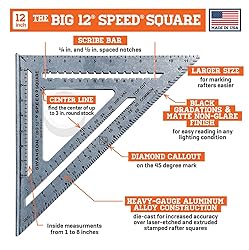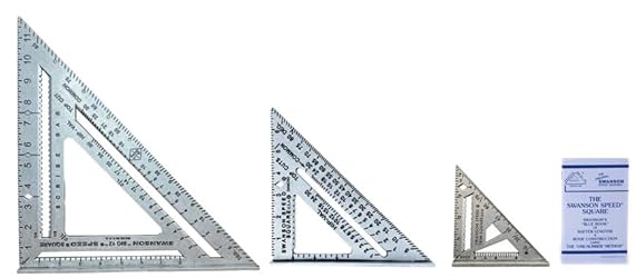 An exceptional collection of three must-have Speed Squares: the 7-inch Speed Square, the "Big 12" 12-inch Speed Square and the 4 and 1/2 inch Speed Trim Square. Each Square is Easy To Use: 1/4-Inch Spaced Scribing Notches on the Speed Square and Big 12; 1/8th Inch Notches on the Trim Square Let You Accurately Mark The Most Common And Popular Stud Widths The Speed Square and Trim Square Feature Swanson's Diamond Cutout For Easy Rafter Seat Cuts These Three Squares Each Include Multiple Gradations For Marking Common, Hip, Valley, And Jack Rafters; Useful For Determining And Marking Angles And Making Square Cuts On Boards Also Includes Pocket-Sized Swanson Blue Book, A Comprehensive Guide To Help Workers Make Correct Angle Cuts For Any Pitched Roof! Dozens of Pages of Tables, Diagrams, Data, and Definitions That Are Essential for Many Different Construction Projects