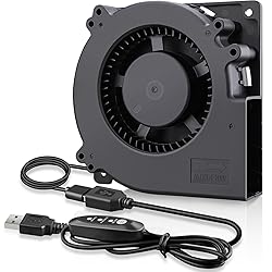 • GDSTIME 1232, Quiet 120mm USB Blower Fan with speed control for Receiver DVR Xbox Modem AV Cabinet Cooling USB Power Plug This is a square 120mm x 120mm blower cooling fan having a thickness of 32mm. The blower comes with a 1.8ft 5V DC USB plug that can power the blower through USB ports found behind popular AV electronics and game consoles; Compatible with wall adapter, car charger, power bank or any USB port. Widely Application The low profile design 12032 quiet USB blower great for tight places ventilation exhaust, can be placed on components which have vents on the top or sides; It is ideal for electronics and components positioned in a cabinet or rack with limited height. Popular applications include Modems, Routers, Receivers, Amplifiers, Xboxs, PoE Switches, DVRs, TVs, Home Theater, AV Cabinets, NUC computer, HTPC, car seat, PC tower, soundbar, laptop cooler and other data center and storage devices, entertainment media centers, etc. Efficient Cooling These DC Centrifugal Blowers squirrel cage fans contain a circular impeller, This design allows DC Blowers to create directed airflow under high pressure conditions; 120mm DC Blower has a more concentrated airflow in which the equipment pulls air in from the sides and forces it out at a concentrated 90º angle. Efficient keep your electronics and components cool and extend the service life. Well Built This usb 120mm centrifugal blower fan that comes with premium quality brushless motor and a long-life sleeve bearing. The fan's housing is constructed of Plastic Material UL 94V-0 P.B.T. which have a high resistance to flammability. Impedance protected motors contains pure copper coil that have a higher resistance to heat during a rotor lock.