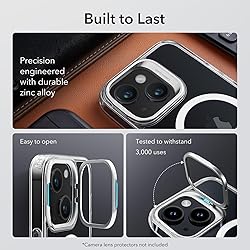 • ESR Classic stand case with HaloLock, compatible with iPhone 14/iPhone13, MagSafe compatible case with stand, military standard protection, built-in camera ring stand, scratch-resistant back, clear. Compatibility: only compatible with iPhone 14 and iPhone 13. Stronger magnetic closure: Strong built-in magnets with 1,500 g holding force ensure a secure closure on any HaloLock or MagSafe accessory. Adjustable Camera Guard stand: Fully adjustable between 0 and 85° to ensure the perfect angle to catch up on your favourite shows, built to last: the sturdy and durable zinc alloy construction ensures that the As the new look of this, While the hinge has been laboratory tested to maintain its strength after more than 3,000 uses. Military standard drop protection: Air Guard corners, scratch-resistant acrylic back and raised edges together ensure that your phone is protected from drops, bumps and scratches