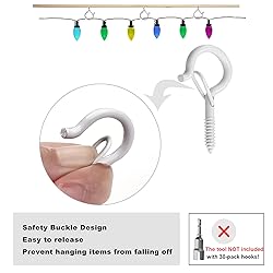 Package Includes: 30 x screw in hooks(white), 30 x drywall anchors and instructions. Safety Buckle Design: Strong clip locks securely and releases easily. No risk of the lights/plants/chimes falling off even in windy days! Good for both outdoor and indoor use. Widely used for hanging string lights, patio lights, bistro lights, fairy lights, Christmas Lights, tea cups, plants, wind chimes, bird feeders, lanterns, and any other decorations such as Christmas or new year decorations… Easy Installation: Drill a pilot hole, insert the drywall anchor if needed and then screw in the hook. Great for eave, patio, deck, ceiling, walls, tree, fence… Sturdy and Durable: Made of quality iron and coated with antirust paint, each hook holds up to 40lbs. Tips: 1. When installing horizontally, screw it into the wall until the clip hole touches the surface to enhance load capacity. 2. These hooks contain functional sharp points, please keep them out of children's and baby's reach.
