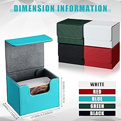 - Features: The card box holder for trading cards is smooth and strong, not easy to fade or break, nice for protecting cards. The leather deck card boxes can hold most standard sized cards, useful and practical gifts for your friends, families or relatives who like collector cards. Specifications: Material: PU leather and magnet Color: black, white, red, green and blue Size: approx. 4.13 x 3.15 x 3. 54 inches Package includes: 5 x Leather deck card boxes large size Notes: Manual measurement, please allow slight errors on size. The color may exist a slight difference due to different screen displays. The brands related above are only for purposes of demonstrating compatibility, not use as trademarks, our trademark is Weewooday.