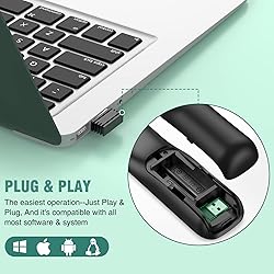【Air Mouse Presentation Clicker】Clicker for powerpoint presentations combines the function of air mouse, with wireless cursor control button and left/ right mouse button, which makes it like a true mouse. With it in your hand, you can be totally smooth from the constraint of keyboard and make your presentation more efficient 【WIDELY APPLICABLE】 Presentation clicker supports systems: Windows 2003/XP/Vista/7/8/10, Mac OS, Android,Linux; Remote clicker for presentation supports software: PowerPoint, iWork (Keynote & Numbers & Pages), Prezi, MS Word, Excel, ACDSee, Website, etc.(Not for Google Slides) 【Bright Green Light & Long Control Range】 Wireless presenter is with a bright green light which is easy to see against most backgrounds; Control Range is long enough to meet your needs: Wireless mouse function range: ≤50FT; RF 2.4Ghz range: 100-165 FT; Green light range: ≤328 FT 【Full-function & PLUG & PLAY】Powerpoint remote is is fully functional: page up/down,volume control, switch windows, hyperlinks, play videos, full/ blacks screen, label/ eraser; No need for any drivers, just plug the usb dongle into a usb port on your mac or pc,easy to use 【ERGONOMIC DESIGN】This PowerPoint clicker is designed to fit nicely into your hand; Features intuitive touch-keys for easy slideshow control, so you can page forward/back without having to look at the buttons,Package included: 1x Presentation Pointer, 1x USB Receiver, 1x User Manual