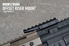 - The Monstrum Shrapnel Offset Riser mount offers the same rock solid performance as the rest of our riser mount line, but with 1 inch of forward extension for more flexible optic placement and eye relief positioning. The picatinny base measures 2 inches (or 4 picatinny slots) in length while the top rail measures 3 inches (8 total picatinny slots). The rail extends an extra 1.5 inch over the front of the base, allowing for more forward positioning of long eye relief optics. Available in low, medium, and high profile heights. The low profile mount provides 0.5 inches of rise over the receiver rail. The medium profile provides 0.80 inches of rise. The high profile provides 1.00 inches of rise. The Picatinny base is equipped with custom recoil stop bolts that slot seamlessly into your Picatinny rail with zero wiggle - guaranteed to hold zero against the toughest of recoil. The single piece machined 6061 grade aluminum profile is designed to shave off precious ounces of weight. Uses hardened steel Torx mounting hardware to prevent stripping of the bolts. All Monstrum mount and accessory products come with a lifetime warranty.
