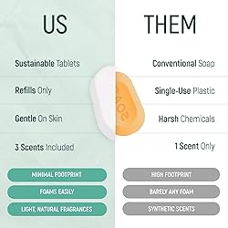 ✔18 PACK HIGHEST QUALITY SMART SOAP FOAMING TABLETS! Our natural non-irritating pods come with a cleansing method formula that contains no harsh ingredients and is gentle to the skin! The moisturizing foam is also kind to sensitive skin, making it suitable for kids as well! Each tablet pod dissolves in your own warm tap water to form 8.5 fl oz of gentle foaming hand soap and is compatible with all foaming soap dispensers! Better for your hands, wallet, and planet! ✔GENTLE, CLEANSING, MOISTURIZING, SAFE & FAMILY FRIENDLY! Our soaps contain no parabens or phthalates. All ingredients are safe, vegan, cruelty-free, environmentally friendly, and sustainable! Each tablet includes surfactants proven to wash away nasties and effectively cleaning your hands! Our feel good concentrated foam is also highly moisturizing thanks to the added glycerin. Say goodbye to dry feeling skin and say hello to clean hands! ✔ZERO WASTE IS OUR MISSION! Green Earth is our goal! Everything from our products to our packaging is sourced with big care and consideration! We understand that millions of concentrate hand soap shampoo and conditioner bottles are being thrown away each year in the U.S. Our focus and determination are fighting plastic waste and being part of the solution to stop it from rocketing That is why our products are always plastic and metal free, made of organic ingredients and zero-waste packaging! ✔100% SATISFACTION OR MONEY BACK! Our dissolvable hand soap packets sheets are portable and convenient and they are 100% recyclable! We love using them and we know you will love them too! If for any reason or no reason at all you decide to return them we will refund you 100%!