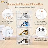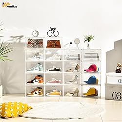 [Transparent Display Design]The clear shoe boxes designed with transparent characteristic,you can quickly choose the shoes which you want at a glance.The Black shoe organizer is also equipped with clear door. Therefore,our shoe display case can be extensively used in entryway,bedroom and closet. [Extra Large Capacity]13.4’’L*10.6”W*8.3”H-The upgraded large shoe display boxes are suitable for US shoe size up to 13,which designed with a larger storage capacity.So don’t worry about the shoe boxes space. The shoe display case can keep your messy shoes well organized.which is suitable for many types of shoes such as boots, leisure, sneakers and high heels. [New Stackable Design & Space Saving]Our shoe storage boxes are equipped with new stackable design,Which you can stack them by placing them directly.In addition,the stackable function can keep the shoe boxes whole very firmly and can be Multi-layered Stacked.And each stackable shoe bins can stay sturdy and easy to carry when integrated. [Magnetic Door and Easy to Open with Single Hand]The shoe storage boxes have built-in magnetic function.The door can be easily opened and closed by the upgraded magnetic suction.In addition,we set vents in the door.Our stackable shoe box has excellent breathability to prevent the accumulation of odor. [Sturdy Material] The shoe organizer is made of sturdy plastic.The stackable shoe boxes can effectively prevent dust from entering in.Easy daily care – clean with mild soap and water.