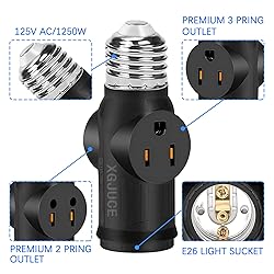 【3-Prong Socket Adapter】 The light bulb socket can be applied to 2 /3 pin(TypeA/B) outlet and 1 bulb socket, a wider range of applications. 【High Quality and safe】The light sockets are made of flame retardant PBT material, heat resistant and long lasting, this outdoor light with outlet attached with US standard. 【Electrical Ratings】E26/E27 socket outlet adapter voltage range: 0-125VAC, wattage: 1250W; This light bulb adapter is not suitable for use in wet locations. 【Wide Application】This light socket extender is good for garage, workshop, basement, porch, patio, Halloween Christmas Outdoor Lights, security cameras. 【Easy to Install】Just turn off the light fixture, remove the existing bulb, and simply screw the adapter.If you have any problem or question, please feel free to contact us directly.