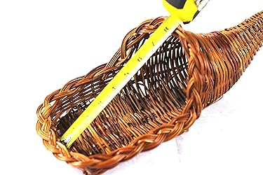 - 14'' long wicker made cornucopia basket for thanksgiving decorations.