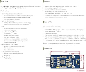 - Overview The USB UART Board (micro) is an accessory board that features the single-chip USB to UART bridge onboard. Features Supports Android/Mac/Linux/WinCE/Windows 7/8/8.1/10/11... Voltage output support: 5V or 3.3V Integrated USB protection device: SP0503 3 LEDs: TXD LED, RXD LED, POWER LED Pins accessible on pinheaders: TXD, RXD, RTS, CTS Other pins are accessible on drilled holes, easily connected to user application system (separate pinheaders are provided)
