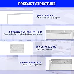 ✔HIGH PERFORMANCE - The LED Flat Panel Troffer light is designed with high-efficiency LED chips in 5000K color temperature, amazing brightness up to 5750 lumens. It's perfect for any home light: bedroom, kitchen, closet, bathroom, living room, garage, basement. ✔SELECTABLE WATTAGES - Our LED flat panel Ceiling light comes with 3 wattages tunable 30W/40W/50W, which offers soft and uniform light distribution through your space, sturdier construction, and no yellowing over time. ✔0-10V DIMMABLE - Smoothly dimming compatible with 0-10V dimmers (Dimmer Not Included). No flashing, No noise. Smooth PMMA cover with uniformity perfect light distribution. ✔EASY INSTALLATION - Drop Ceiling Panel Light can be built-in directly with slim installation depth. They can be mounted as a ceiling-mounted ceiling lights or suspended free-hanging luminaires to meet your lighting needs.
