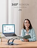 360 Rotation: This laptop stand lets you turn your laptop to any angle thanks to its 360° rotating axis that connects to the base. The rotating laptop stand for desk allows you to easily share your screen with someone sitting across the room or at another desk. It also works great for ideas sessions when collaborating with others over video chat or calls. Support Second Screen: This Swivel laptop stand can bring your laptop up to the level matching your monitor, holding your laptop as a second screen to smooth your flow while working or studying. The hinges are tight so that the laptop can be kept it stay in the right place. Improving Posture: Features the 6000 times rotation tested dual hinges, you can adjust the height and angle of the laptop riser to set the most comfortable position while using your laptop. Because of its ergonomic design, the laptop stand adjustable helps reduce your chance of developing back and neck problems. Less stress, more focus. Portable Comfort Helper: Thanks to the foldable design, you can take your laptop and this portable laptop riser wherever you go. You can set it up wherever you are as a comfort aid. The laptop stand is simple to transport whether you wish to work in a coffee shop or a library. Wide Compatibility: The size of the ergonomic computer stand can accommodate various laptop and tablet sizes. Up to 10 to 17 inches of gadgets can fit inside. The laptop stand also contains hooks and a non-slip silicone cushion, ensuring your device (up to 22lbs) will never slide when you're using it.