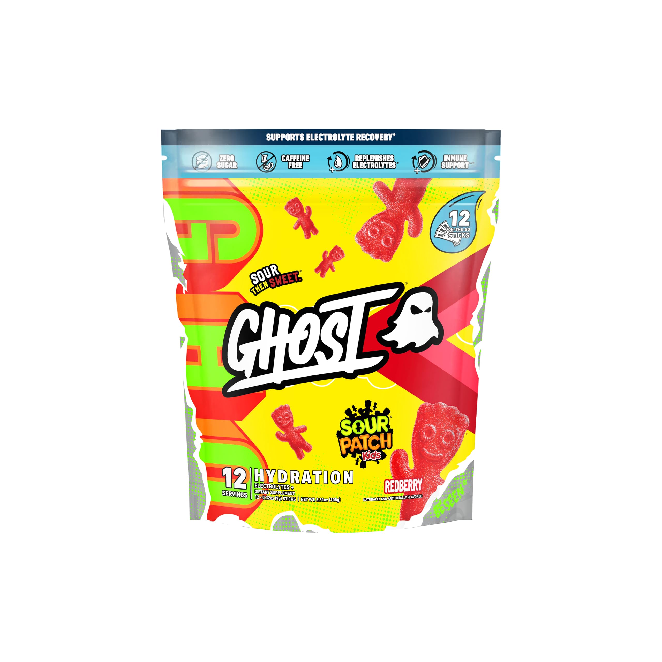 - GHOST Hydration Packets, Sour Patch Kids Blue Raspberry, 24 Sticks, Electrolyte Powder - Drink Mix Supplement with Magnesium, Potassium, Calcium, Vitamin C - Vegan, Free of Soy, Sugar & Gluten