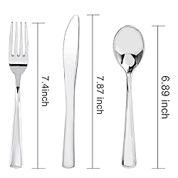 - Our plastic silverware set, featuring an elegant designOur plastic silverware set, featuring an elegant designation to any table setting, featuring an elegant design, adds sophistication to any table setting, ideal for impressing guests at weddings, parties, and holidays. The heavy-duty yet disposable utensils ensure easy cleanup or recycling post-event. Suitable for diverse occasions from casual home dining to festive celebrations like Halloween, Thanksgiving, and Christmas, this value pack includes 300 pieces—100 forks, 100 spoons, and 100 knives—ensuring ample supply for your gatherings.