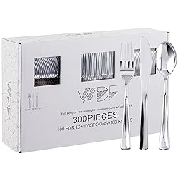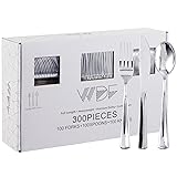 ELEGANT DESIGN:Our plastic silverware perfect for the table arrangement, add an elegant atmosphere to your party. Dress up your table with our plastic silverware heavy duty to impress your guests! Disposable & Easy To Clean:These silver plastic silverware can be easily disposed of or recycled for quick party clean-up. Christmas silverware. SUITABLE FOR THE SCENE: WDF plastic silverware perfect for wedding, party, Halloween, Thanksgiving, Christmas, or even usual home dining. VALUE PACKAGING:A set of 300 Party Bulk plastic cutlery, Include 100 silver forks, 100 silver spoons, 100 silver knives for your party and everyday use. SERVICE AND COMMITMENT:If you encounter a problem, please communicate with us and we will try our best to help you solve it.
