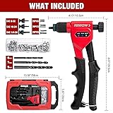 What's Included: This Arrow RNT1 Rivet Nut Gun Tool Kit features an 8" gun with 3 sizes of mandrels (8-32, 10-24, 1/4-20), and 3 sizes of drill bits (6/7/ 9mm), in addition, there are 75 matching nuts (25pcs 8-32, 25 pcs10-24, 25 pcs1/4-20), all of the nuts are packed in a small storage box. The whole set of tools is stored in a high-quality blow mold case for quick and easy tool organization, it's an essential one-stop solution for your next riveting project Designed for Riveting in Tight Space: The rivet nut tool features a smaller gun body width, which is designed for riveting in tight spaces or hard-to-reach areas, perfectly solving the problem that traditional nut guns cannot work in small spaces. The rivet gun adopts a modular detachable design, which is easy for riveting, and mandrel replacement, and the rotary knob structure for convenient nut loading and release High Quality Carrying Case: The rivet nut tool sets are neatly stored in blow-molded boxes for easy storage and portability. The handle on the storage box makes it easy to carry tools with you. The aluminum alloy body and blackened surface treatment make the tool more high quality Ergonomic Design: Arrow rivet nut gun adopts a lightweight steel body, which reduces the burden of use and makes the wrist comfortable for long-term work. Comfortable and easy-to-squeeze handle with PVC non-slip design fits the curve of the hand, easy to use. Not recommended for use with 1/4-20 in.(M6) Dia all-steel rivnuts; stainless steel rivnuts are not for use with manually operated rivet nut tools Wide Application: The RNT1 Rivete Nut Tool Kit is perfect for projects involving sheet metal, gutters, storm doors, and automotive repairs. This easy-to-use manual rivet nut gun tool set belongs in the toolbox of any professional or serious DIY-er.