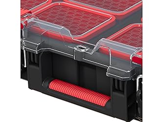 Ideal tool organisation storage system perfect for crafters, DIY-ers and hobbyists Lightweight with ergonomic top handle with soft rubber grip and side grips for comfortable, easy portability Multiple sized removable bins for custom configuration & Transparent, polycarbonate lid to offer easy visibility Can be easily stacked on other storage units within the STACK N’ ROLL system Locking assurance with toggle, heavy duty metal latches with audible closing indication. Padlock eyelet for lockability (lock not included)