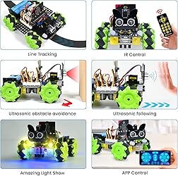 【Microbit V2 Mecanum Robot Car】4WD Mecanum Robot Car is based on IO Port Shield Sensor Extension Board with Level Conversion for micro:bit. The Driver Board integrates with 4 WS2812B RGB LEDs, 2 IR Receivers, 2 Rainbow LEDs, power switch,Line tracking sensor & potentiometer, motor drive ports, battery holder,and more important Building Block Extension Holes. 【FLEXIBLE & POWERFUL】 (1)The 4 drive Mecanum wheels make it possible to move in all directions(360°) and drift to left or right. (2)The 4 DC Motors provide continuous strong power and each wheel can be programmed. It is in wild outlook and could go through obstacles easily. 【Makecode Graphical Programming & Python Code】we provide 2 tutorials in .pdf format (MicroPython & Makecode that can switched to Javascript), easy to learn microbit programming and electronics computer skills. About 20 Projects you can program to operate the robot car: Grade Climbing, Avoid Obstacles, Ultrasonic Follow, RGB Colorful Light, IR Remote Control and APP wireless control. 【Wireless IR & Blue-tooth Remote Control】Based on IR Receiver and micro:bit built-in Blue-tooth function. Able to remotely controlled by keyes mecanum_robot APP (Android/IOS). 【IMPORTANT NOTE】Includes a Micro:bit V2.2 board! The lithium battery (rechargeable) is Not included! please prepare yourself. More details and Tutorial download please search on keyestudio website. The kit is intended for ages 15+