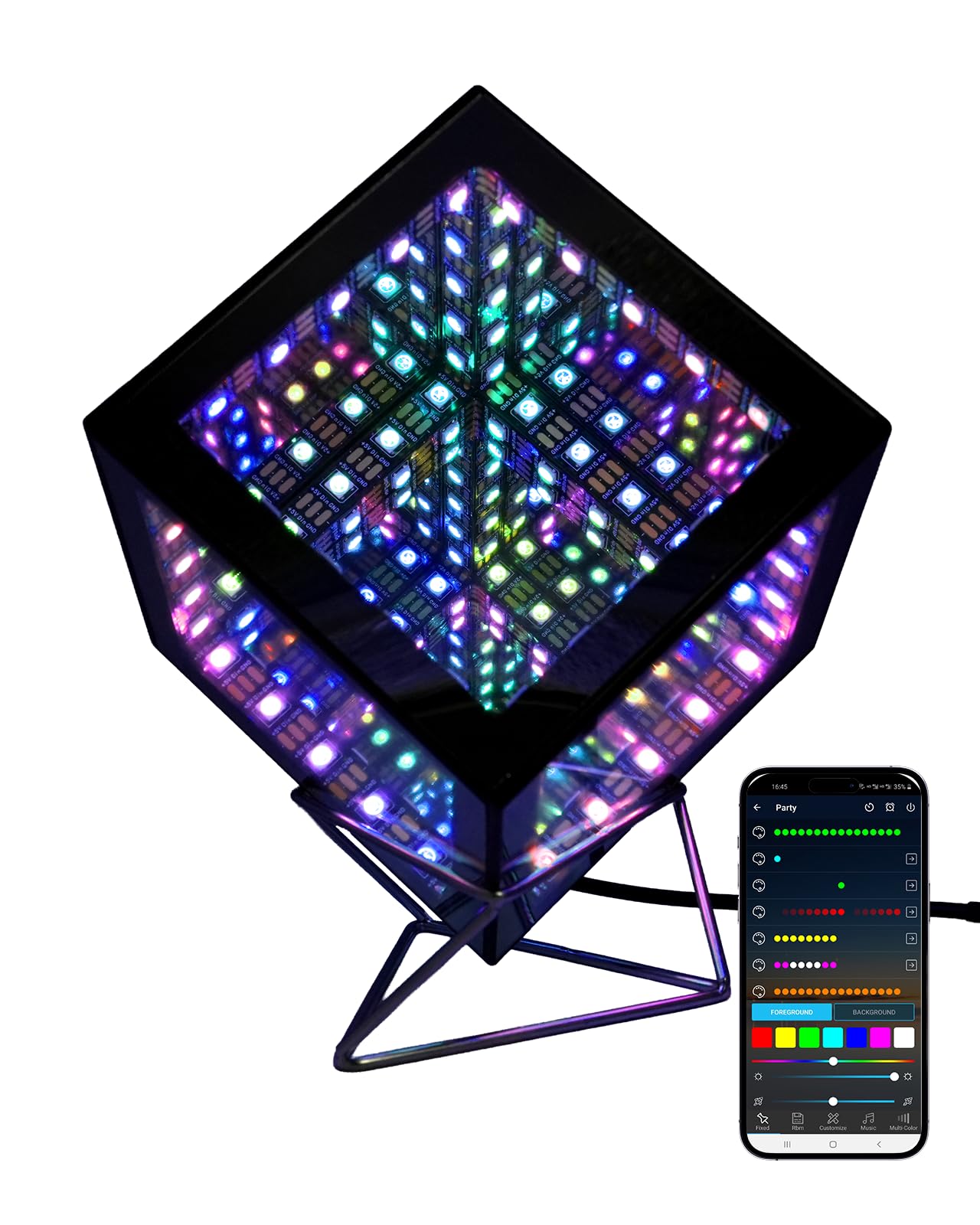 • HYPERCUBE NANO: MARVEL AT THE INFINITE GALAXY OF LIGHTS ANYWHERE, ANYTIME A merger of art and technology, enjoy a universe of infinite light with the futuristic and portable 5.5-Inch USB-C Powered HyperCube Nano Infinity Light. Designed by electronics engineers, its custom-written programming triggers LEDs with a range of animations and infinitely shifting color palettes. The HyperCube Nano Stand Show off your HyperCube Nano and make it the focal point of any room by displaying it using the included NanoStand. The stand is designed to elevate the HyperCube Nano in a diamond-like shape and elevate it into an even more striking art piece. Maximum brilliance! Choose between the 3 modes: Kaleidoscopic: Over 16 million colors, varying speeds, dynamic color palettes, and shifting symmetries (40 patterns). Meditative: Calm and classy. The soothing pulse and glow of these patterns are ideal for nightlights and meditation (24 patterns). Sound Reactive: Musical frequencies are converted to light with a microphone, analyzing musical lows, mids, and highs to create infinite audio-visual experiences (31 patterns). Some of HyperCube's Best Uses: Gaming Room - get the ultimate game room aesthetic Music / Party Room - the reactive LED lights in the HyperCube Nano sync to the beat of your music Interior Lighting Addition - makes a great decorative lighting to your living room or dining room Statement Piece - this makes a modernist art piece with its minimalist polymer black frame and hyper-mirror HyperCube Set - using the app, link together to sync their light display. Using its Sound Reactive mode, these make a perfect party light decor as the lights will sync to the music. Aesthetic Backdrop - make an object stand out by using the HyperCube as the backdrop