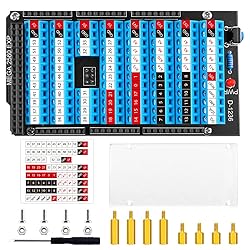 This is a terminal hat for Arduino mega 2560 R3. Terminal block pitch 3.5mm/0.138";Wire size range 26AWG to 16AWG, strip length 5mm Screw M2 steel;FR-4 fiber glass PCB, dual copper layers. Reset button and LED indicator. Package includes:1 x Terminal hat for Arduino Mega 2560 R3(Note:Arduino Mega 2560 development board is Not Included), 8 x M2.5 screw, 4 x Long copper pillar, 4 x short copper pillar, 1 x Acrylic protection panel