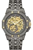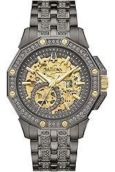 - From the Crystal Collection, the bold Octava timepiece, in gray stainless steel with gold-tone accents, gets a luxurious update with an open aperture 21-jewel automatic movement in a signature Bulova design embellished with 251 gray-colored crystals on the bezel, bracelet and dial. This timepiece also has a double-press deployant buckle closure and is water resistant to 30 meters. You’re sure to make an unforgettable impression with this bold men’s watch on your wrist.