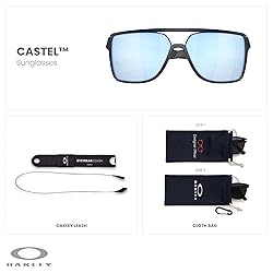 Authentic Oakley Castel OO9147 sunglasses with accessory leash and cleaning kit Polarized lenses block glaring sun reflection and reduce eye strain Lightweight plastic frames and lenses for comfort and durability Prizm Deep Water lenses enhance color and contrast Designed for men with sleek rectangular shape