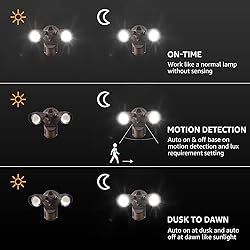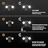 Newly Upgraded: This 3CCT security light has three color temperatures of 3K/4K/5K. Buying one is equal to buying three. Don't worry about buying the wrong color temperature, and eliminate the trouble of returning or replacing goods caused by the improper color temperature Triple Operation Modes: Choose from three modes to fit your needs. On-Time mode offers manual control, Auto mode activates with motion at night, and Dusk-to-Dawn mode turns the light on at sunset and off at sunrise for hands-free security Light Up Any Dark Corner: The 180° motion sensor detects movement up to 59 feet away. The 360° adjustable lamp heads deliver 3000 lumens of bright light, perfect for porches, garages, and yards without disturbing neighbors Durable and Lasting: Built with a sturdy aluminum body, this light is designed for durability. It resists wear, dissipates heat efficiently, and withstands sun, rain, and snow, ensuring reliable operation year-round Reliable Quality: This security light is ETL and FCC certified for safety and reliability. With a 50,000-hour lifespan and a 3-year warranty, you can trust it to provide long-lasting performance and peace of mind
