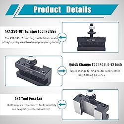 - AXA Tool Post 250-101 Wedge Type Quick Change Tool Post 6-12 Inch Lathe Swing Specification:Material: steelTool Bit Range: 3/16-1/2 inch Features:- The wedge lathe tool post holder is made of steel- AXA tool post set ground and hardened, assure repetitive accuracy, with strong rigidity and high hardness- Quick-change tool holder feature a design that provides built-in quick-change versatility and positive stiffness to meet the tightest working tolerances- Built in quick replacement tool versatility, can be quickly replaced tool rest- Quick change tool holder kits can be quickly and easily mounted on the engine, table or turret lathe for a variety of operations Package Includes:AXA tool post holder 250-101