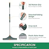 FOLDABLE DESIGN: Our turf rake for artificial grass has a foldable handle for easy storage and portability. Simply press the center latch of the handle, you can fold and unfold the rake to make it compact and convenient. QUALITY MATERIAL: The bristles of our artificial turf rake are made of dense PA flame retardant nylon plastic. Can be used on turf and carpet. Easily and gently removes debris from artificial turf. The handle is made of stainless steel rod for longer service life. VERSATILE USE: Our collapsible artificial turf rake can be used for more than just raking artificial turf. It can also be used to comb and maintain artificial grass, remove dead leaves or branches from flower beds, and even clean pet hair from carpets or upholstery. Efficient Cleaning Design: Equipped with an upgraded dense bristle head that swiftly and gently removes leaves, dead grass, pet hair, and other debris from artificial turf. Keeps your lawn surface clean, fresh, and well-maintained with minimal effort. EASY INSTALLATION: You can unfold the rake by pressing the locking button in the center of the handle, and then insert the locking button on the head of the handle bar into the rake head to complete the installation.