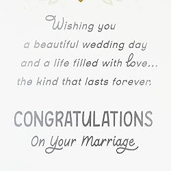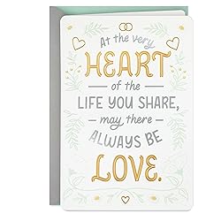 Wish the happy couple well on their wedding day with a beautiful card and a warm sentiment. Cover features foil accented lettering on a background of white flowers, greenery, and hearts. Message reads: "At the very heart of the life you share, may there always be love." Inside reads: "Wishing you a beautiful wedding day and a life filled with love . . . the kind that lasts forever. Congratulations on your marriage." Congratulations card measures 5.8" x 8.3" and comes with a coordinating envelope. Printed on high quality paper stock, Hallmark's greeting cards are made with paper from well-managed forests.