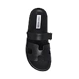 - The leather MAYVEN slides feature comfy construction details like a molded footbed, a treaded flatform sole, and an adjustable top strap, plus a front strap with a geometric cutout design.