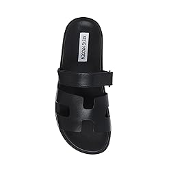 Fit Tip: The MAYVEN flatform sandals run small—we recommend sizing up a half size for the perfect fit. Adjustable, Secure Fit: Featuring a hook-and-loop adjustable top strap, these women's sandals offer a customized fit, ensuring all-day support and easy wear. Chic Geometric Detailing: The wide front strap showcases intricate cutout details, adding a trendy, fashion-forward touch to this elevated flatform sandal. Superior Comfort & Lift: Designed with a molded footbed and a 1.25-inch treaded flatform sole, the MAYVEN provides extra cushioning, traction, and a subtle boost for all-day wearability. Quality Materials, Lasting Wear: Crafted with a premium leather upper and a durable synthetic lining, sock, and sole, these Steve Madden sandals offer long-lasting style and versatility. Keep well-polished. Polishing keeps shoes looking good, as well as keeping leather soft. As a preventative measure, it's advisable to apply several coats of transparent polish before shoes are worn for the first time