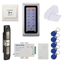 - We provide video guide+Detail wire diagram, so you can easily setup System Package: 1 x Metal Keypad RFID Access Controller 1 x ANSI Standard Strike Lock 1 x Power supply Unit(110-240V) 1 x Exit button 10 x ID cards 10 x RFID keyfobs 1 x Installation Kit 1 x User Manual+Wire Diagram CD Metal Controller Features: Waterproof Degree: IP68 Metal structure design, anti-vandal Digital backlit keyboard Full programming from the keypad User capacity: 2000 card user card, 2000 user password Three way to open the door, card, password, card + password Support Wiegand 26 input from connection to external reader or Wiegand 26 output for connection to a controller Adjustable door output time,alarm time,door open time Very low power consumption (30mA) Fast operationg speed,<20ms with 2000 users Lock output current short circuit protection Easy to install and program Built-in light dependent resistor (LDR) for anti tamper Buili-in buzzer Red,yellow and green LEDs display the working status Power Supply Unit: Input Voltage: AC110-240V Input Frequency: 50-60Hz Output Voltage: DC 12V/3A Adjustable Locking Delay: 0-15sec Electric Strike Lock: Lock Size : 123Lx43Wx42H(mm) /4.84Lx1.69Wx1.65H(inch) Strike Structure : Stainless Steel Holding Force : 1000kg Failure secure mode (Locked when power is removed) Suitable For : Wooden Door,Metal Door,PVC Door Voltage : DC12V Current : 320mA High-Temperature Painted,Duable and Beatiful Artical Testing to 1000000 cycles Exit Button: Performance Testing: 1000000 times aging test Size: 86mm*86mm Use: When you want to go out, you just need to press this Exit Button Keyfobs: Operation Frequency: 125KHz