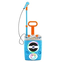 Become an immediate superstar and sing along to built-in songs and melodies, or your favorite hit tunes through Bluetooth wireless technology Sound like a robot, change the song speed and more with fun tempo and voice effects Add a dazzling light show for maximum entertainment thanks to the colorful party lights Easily take the sold-out tour on the road with the adjustable handle, mic and stand Intended for ages 3+ years; requires 4 AA batteries; batteries included for demo purposes only; new batteries recommended for regular use