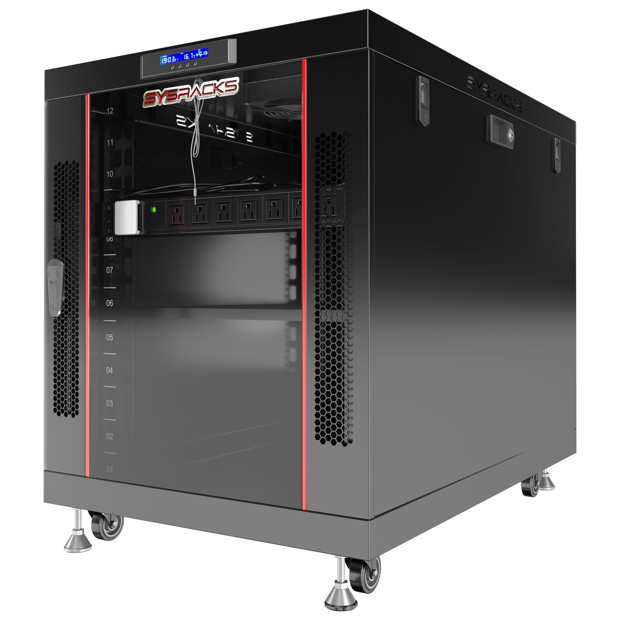 - This 22U server rack cabinet is a free standing enclosure designed for standard 19 inch rack mount IT, network and AV equipment.The 22U height provides additional vertical space for expanding network setups while maintaining a compact footprint.The enclosed steel construction with locking doors helps protect servers, switches, routers and telecom equipment in office or server room environments.Integrated cooling fans with thermostat and LCD display support proper airflow and temperature monitoring.ANSI/EIA-310 compatible adjustable mounting rails allow flexible equipment placement. The cabinet includes an 8-outlet PDU, shelf, locking casters, leveling feet, cable entry brushes and mounting hardware.