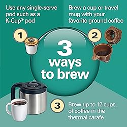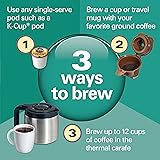 3 WAYS TO BREW: Brew a single cup with a pod or coffee grounds or brew up to 12 cups using your favorite ground coffee. To brew one serving, you have the option to brew up to a 10 oz. cup with a pod or brew up to 14 oz., 7" tall travel mug with coffee grounds. FAST BREWING: In the morning, every second counts. The FlexBrew TRIO Coffee Machine with 12 Cup Thermal Carafe prepares an 8 oz. cup of coffee in about 90 seconds, so you have more time to enjoy your coffee. BREW 7 SINGLE SERVINGS WITHOUT REFILLING: Enjoy a quick cup of coffee without stopping to pour water into your coffee maker. The removable 56 oz. water reservoir of this thermal carafe coffee maker saves you time because it needs fewer refills. KEEPS COFFEE HOT AND FRESH LONGER: Pour 12 cups of hot, fresh-tasting coffee with the stainless steel thermal carafe. Because it insulates hot coffee without the need for a heating plate, there's no fear of coffee losing its fresh, just-brewed flavor. 5 SINGLE-SERVE SIZES: Customize the brewing size to your cup. Simply select 6, 8, 10, 12 or 14 oz. before you brew with ground coffee or choose 6, 8 or 10 oz. when brewing with a pod — you'll get the perfect amount in your cup.