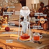 【SEALED EXTRACTION REDUCES FLAVOR LOSS】 The iced coffee maker fully adopts the closed extraction technology,and is equipped with a PC lock aroma cover and a high borosilicate glass cover, which can greatly reduce the loss of flavor. Our cold brew coffee maker keeps the fruity and sweet taste of coffee and reduces the acidity, so you can enjoy a refreshing and delicious coffee. 【PRECISION STAINLESS STEEL FILTER】 The cold brew coffee maker uses a precision stainless steel filter, which can filter most of the coffee grounds tightly. The filter screen of the iced coffee maker adopts an embedded design, which can prevent the loss of flavor while filtering the coffee. We will also give you 100 pieces of filter paper for precision filtration. You can enjoy coffee without coffee grounds with peace of mind. 【ADJUSTABLE DROP RATE】 The drip coffee maker is equipped with an adjustable drip valve, which allows you to freely adjust the drip speed of the water droplets, thereby adjusting the time taken for the entire extraction process. Under normal circumstances, it is enough to adjust the water droplets to drop slowly and evenly. The next thing is left to time, and you will be able to get a refreshing cup of coffee. 【HIGH BOROSILICATE GLASS MATERIAL】 The ice drip coffee maker at the bottom of the ice extraction pot is made of high borosilicate glass, which is resistant to cold and heat and is not easy to burst. The high borosilicate glass bottom pot can perfectly fit the filter to prevent the loss of flavor. The jug body is equipped with a sharp spout, which is convenient for you to pour the extracted coffee into other cups or milk. 【MULTIPLE USES】 This ice drip coffee maker can be used not only to extract coffee, but also to extract various teas, such as black tea and green tea. You can easily enjoy a strong and refreshing iced coffee or tea at home. In addition, the stainless steel filter can be removed separately, and you can also use it to make hand-made coffee. In short, the iced tea maker provides you with a variety of usage options.