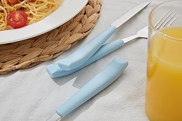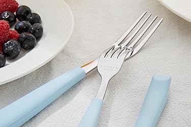 Complete 20-Piece Flatware Set for 4 – Includes 4 dinner forks, 4 salad forks, 4 dinner knives, 4 dinner spoons, and 4 dessert spoons. Dimensions (Height) - Salad Fork: 6 1/2“ (16.5 cm), Dinner Fork: 8” (20 cm), Table Knife: 8 3/4“ (22 cm), Tablespoon: 7 1/2“ (19 cm), Teaspoon: 6 1/4“ (16 cm) Colorful Plastic Handles – Modern, vibrant, and colorful handles add a playful yet elegant touch to your table setting, perfect for brightening up everyday dining or themed gatherings. Comfortable & Functional Design – Balanced weight and smooth rounded edges make each piece easy to hold while ensuring reliable performance for casual or formal dining. Ergonomic handles with a smooth finish make mealtime comfortable and enjoyable. Premium 18/0 Stainless Steel – Crafted from high-quality, food-grade stainless steel with extra thickness for lasting durability, a comfortable hand feel, and a luxurious dining experience. Mirror-Polished Finish – Each piece is carefully polished to a high shine, creating a sleek, reflective surface that adds elegance to formal dining while staying resistant to stains and easy to clean. Dishwasher Safe & Easy Care – Designed for convenience, this flatware set is easy to clean and maintain without losing its color or shine. Perfect for Every Occasion – This elegant and durable flatware set makes a thoughtful choice for weddings, housewarmings, road trips, camping, RVs, birthdays, anniversaries, or holiday gifts, such as Christmas, Mother’s Day, and Thanksgiving.