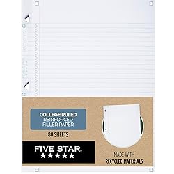 - LASTS ALL YEAR. GUARANTEED!* Give yourself plenty of space for notes and reminders with Five Star Recycled Reinforced Filler Paper. Scan, study and organize your notes with the Five Star App. Create instant flashcards and sync your notes to Google Drive to access them anywhere from any device. Each pack has 80 loose-leaf college ruled sheets made with 100% recycled post-consumer waste paper. Reinforcement tape is made with 90% recycled materials and resists tearing from rings. Our patented triangle-shaped holes are more durable and turn easily along binder rings. Made with SFI certified paper. *Guarantee is valid for one year from purchase date. Does not cover misuse.