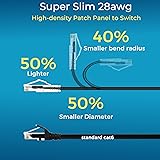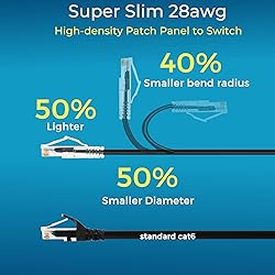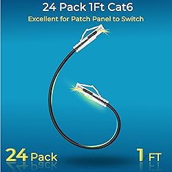 【24 Pack】24-pack of CAT6a patch cables with short length is excellent solution for connecting patch panel to switch and other various devices in high performance. Available in various colors and length of cable patch cords. 【Super Slim】The 28 AWG 1 foot ethernet cable is at least 50% smaller in diameter than 24 AWG cat 6 patch cables. Makes cat 6 ethernet cable 1 ft easy to route through cable management panels. 【Widely Use】Cat 6 patch cables 28AWG is specially designed and have become widely used in data center applications. In fact, Cat 6 cables can be used in all applications where patch cord in need. 【Cooling & Airflow】 Above cat6a patch cable can improve airflow and reduce pathway congestion in high-density datacenter. 【Clear Snagless Clip】Clear Snagless Clip of cat 6 ethernet cable 1 ft black make it easy to see the switch port and light. Also, easy release from port and save time for patching installation. 【10G Applications 】Cat 6 patch are golden plated to support better network connection up to 10G speed 550MHZ ethernet network. 28AWG patch cable is compatiable with the latest TIA-568.2-D standard and support POE.