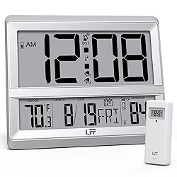 LFF Atomic Clock Large Display, Digital Wall Clock with Indoor Outdoor Temperature and Date, Wireless Outdoor Sensor, Digital Desk Alarm Clock Battery Operated for Bedroom, Easy to Read,Sliver