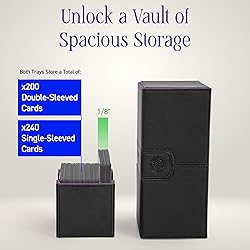 PREMIUM MAGIC THE GATHERING DECK BOX: Elevate your game with the Infinity Vault Sideloader 200, a Magic the Gathering card box designed for streamlined play. Featuring dual sideloading trays, this MTG card box allows for easy access, quick setups, and fast draw times. Its double deck box design fits two double-sleeved decks with an extra ⅛ inch per tray, making it the ultimate MTG commander deck box. DURABLE & PROTECTIVE CARD STORAGE: Keep your deck battle-ready with our Magic card box, made from water-resistant and scratch-resistant PU leather. The sleek microfiber interior with a satin finish safeguards your collection in style. The separate dice vault securely stores over 14 dice, ensuring your cards remain pristine and protected. MAXIMUM SECURITY FOR YOUR DECK: Our Magic the Gathering deck box features strong magnetic closures for superior protection. The three snap-and-shut covers ensure that your deck box MTG stays locked tight, whether in battle or on the move. Drop it, shake it, or store it—your cards stay safe. PORTABLE & TOURNAMENT-READY: Designed for both casual players and competitive warriors, our card deck box is lightweight yet sturdy, making it the perfect Magic the Gathering card storage solution. Whether for MTG, Lorcana, or other trading card games, this deck box TCG is built for durability and style. ULTIMATE CARD GAME ORGANIZER: The Sideloader 200 is available in five bold colors and features dual sideloading trays, a dedicated dice and accessory tray, and three secure covers to keep everything in place. A must-have MTG deck box commander for strategic players who value quality, function, and superior deck protection.