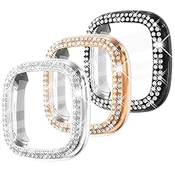 Fullife 3-Pack TPU Bumper for Fitbit Versa 4 Screen Protector, Crystal Diamond Bling Case HD Full Protective Cover for Men Women, Fitbit Versa 4/Fitbit Sense 2 Smartwatch, Black/Rose Gold/Silver