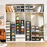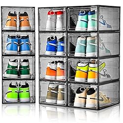 [Advanced Transparent Body for Shoe Display] Our shoe storage boxes designed into advanced transparent and black color,you can find out the shoes with a glance over the stackable shoe boxes without open the boxes.You can collect and display the sneakers,high heels,leisure shoes. [Stackable and Study ]There are lock catch between the shoeboxes, which allow the shoe boxes to be linked vertically as a whole and prevent them from tilting and falling. The frame of shoe box greatly enhances the stability.The shoe box can be combined easily according to the storage space. Such as entryway,under the bed,closet,toilet,etc. [Dustproof, Moisture-Proof] Our shoe storage boxes are made of high density material,effectively protect shoes from dust and moisture. [Multifunctional and Large Capacity](13.8”x 9.84”x 7.1”)The advanced and superior shoe storage box can be applied to wide range of situations such as cosmetics storage,closet storage,desktop storage,bathroom storage,etc.Make your life more advanced. [Easy to Assemble & Sturdy Hard Structure] Amllas shoe boxes are made of sturdy plastic material.Equipped with strong and sturdy door frame construction,which can keep the shoeboxes strong and not to collapse even when stacked.The corners of the shoebox are smooth,you can complete the assembly process in a few simple steps. [Magnetic Door]The door of the shoe box equipped with upgraded magnetic suction design, which makes it easy to open and close the door even with one hand. Easy daily care-clean with mild soap and water.