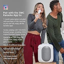 Revolutionary Karaoke Technology: Singing Machine's SingCast Ultimate introduces the first-ever integration of exclusive SingCast video streaming and Pitch Lab technology, enhancing your karaoke sessions with professional vocal effects, harmonizing, and pitch correction. Cast karaoke lyric videos from your phone or tablet to your TV for an authentic karaoke experience. Showcase your singing skills with studio-quality sound! Includes 2 wireless VHF microphones, microphone stand, and AC adapter. Dynamic Sound and Visual Experience: Whether hosting a party or enjoying a family karaoke night, this machine turns your living room into a concert hall. This system boasts a powerful 50W output, delivering crystal-clear audio that fills your space with quality sound. Features Bluetooth streaming and a record and playback function. Enjoy the music synchronized light show that pulses to the beat of your songs and elevate your performance atmosphere. Flexible and Versatile Setup: Includes two wireless microphones and an adjustable mic stand with a secure holder for your devices, perfect for reading lyrics comfortably. The main unit can be used independently or with the mic stand for a customized setup, offering versatility whether you're performing solo or dueting. Features a built-in rechargeable battery that provides up to 10 hours of continuous fun on a single charge (battery life may vary based on usage). Try It with the SMC Karaoke App: Get one month of access to the Singing Machine Karaoke App. Includes catalog with 100,000+ licensed songs, including 300+ original licensed Disney songs. You can queue up to 100 songs or choose from ready-made party mixes. About Us: Singing Machine is a leading provider of consumer karaoke systems. Our high-quality products bring the joy of singing and entertainment to homes worldwide, providing fun and memorable experiences for music enthusiasts of all ages.