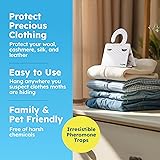 • No matter how well you take care of your clothing, moths always find their way into your closet and ruin your garments! They can be extremely hard to locate, but can cause a big problem in closets, cupboards, curtains, upholstery, and carpets! If you’re finding irregular holes in your natural woven apparel, such as cotton, wool, cashmere, or tiny white eggs or larvae in your closets or carpet, then you may have a moth infestation! Our Clothes Moth Traps use a specific pheromone to lure adult moths and trap them with a double strength sticky trap from which there is no escape. Directions for Use: Open the individual trap package. Peel off the protective sheet. Fold trap and tuck the tab into place. Check weekly and replace every 12 weeks or as soon as the trap is full.How to Place: Hang 2-3 traps inside closets, cabinets, or storage area, and place one near the floor area to address infestations underneath furniture. Add additional traps near any food storage areas around your home.