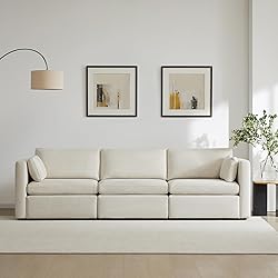 3-Piece Modular Sofa with Larger Seats - CHITA modular couches feature clean and classic design with comfortable and wider seats to offer you a never ending relax after a long day. Each seat has a 34'' seat width - 30% larger than most counterparts. Individual seat dimension: 34''W x 21.5''D x 18.5''H. Only three seats are needed to achieve a 112'' overall width. Rearrangeable for any Occasion - Available in multiple configurations, the modular pieces can be easily rearranged to fit both small and spacious living rooms, family rooms, basement playrooms, etc. To accommodate different occasions and gatherings, the modular combination allows you to pull the armless chair out as a standalone piece. A Dive into Comfort - Comfort is intimate and personal. With CHITA modular sofas, comfort is a feeling that there is nowhere else you want to be. The sofa frame is luxuriously padded with high density foam and topped by loose cushions. Soft, reversible back cushions and arm pillows are padded with a soft blend of fiber. Cozy, non-reversible seat cushions have fiber-wrapped, high-resiliency foam, which is CertiPur-US certified. Cushions can be easily fluffed to maintain a clean look. Seat firmness: medium. On a scale from 1 to 5 (5 being firmest), it's a 3. Premium Quality - Each CHITA modular piece is made by the skilled hands of artisans who have melted functionality and design. Sturdy corner blocked wooden frame is expertly crafted from solid engineered wood and hard wood. All wood is kiln-dried for added durability. High-gauge sinuous springs and synthetic webbing suspension provide additional support for seat and back cushions. Weight capacity for each seat: 350 lbs. Care Instructions - For non-removable areas, blot and spot clean immediately with a clean, absorbent cloth and a water-free stain remover (Cleaning Code: S). Cushion covers are dry clean only. Four Packages - The 3-piece modular sofa comes with 4 boxes and may arrive at different dates. Each box is designed and packaged to maximize shipping efficiency and fits narrow staircase and elevator. Minimum door width: 18'' Box 1: Arms Box 2: Left seat & backrest Box 3: Right seat & backrest Box 4: Armless chair
