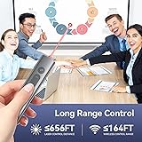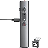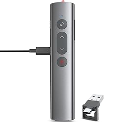 [Presentation Clicker & Laser Pointer] This is a computer clicker with a very bright red laser pointer. You can change your PPT/ Google slide from anywhere in the room, while pointing the specific parts of the slide by laser. PowerPoint clicker controls range:98FT/30M, laser pointer range: 328FT/100M. [Easy to use] Plug and play. Simply plug the USB-C/USB-A receiver into the computer laptop. No installation software required. clicker for powerpoint presentations works seamlessly with a variety of systems & softwares. Presenter clicker wireless advances and rewinds your presentation slides with ease. [Rechargeable Slide Clicker] Power Point slide clicker worktime lasts for over two months or 200 days standby time from single charge. Enjoy fast charging, to fully charge the pointer clicker for presentation only 55 minutes via cable. Providing convenient charging way with no strings attached. [USB-C & USB-A 2 in 1 Dongle] With the special & practical patented design of Type-C & USB-A 2 in 1 Dongle, powerpoint remote clicker receiver is not only fit for devices with USB A interface, but also for devices with Type-C interface, such as recent edition MacBook, Mac Mini, HP EliteBook 1050/755, Dell Latitude Vestro 7000/5000 Series, etc. [Powerful Compatibility Wireless Presenter Remote for Presentations] Slide Advancer supports these operating systems: Windows 2003/XP/Vista/7/8/10, Mac OS, Linux.This office presentation remote clicker supports softwares: PowerPoint, Keynote, Prezi/Word/Excel/ACD See/iWork, etc.