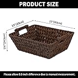 Polypropylene Plastic Wicker Come in a set of 2, and measures 17"L x 13"W x 5¾"H each. Handmade and may vary 1/4 inch in size, the trapezoid decorative baskets are ideal for organizing letters, gift baskets, hand towels, toilet paper, accessories, snacks, etc. The woven storage baskets are moisture-proof and can be cleaned by flushing with water, perfect for pantry, home office, and bathroom storage. Each pantry basket features 2 sturdy wooden handles make it easy to transport from shelf to counter. With hand-knitted unique textures, the storage wicker baskets easily double as decorative baskets even while they store your personal care products, toilet paper, or soda pop bottles, energy drinks. Committed to clutter-free and organized for your shelves, the storage baskets with handles are ideal to be used as makeups organizers or nick-nacks containers.