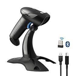 COMS Sensor Barcode Scanner: High pixels extreme performance COMS optical lens, easilyscanning 3 mil high density and long barcodes. The scanenr can scan 1D/2D codes on digital screens, such as phone screen, tablet screen, glass surfaces, plastic shrink wrap, etc. Long Distance Wireless Transmission: Bluetooth 5.0 features more transmission distance, reach to 30m/90ft. 2.4 G wireless transmission, delivers up to 100m/330ft transmission in open air, and 20m/66ft transmission indoor. Long Battery Life: The bar code reader is equipped with rechargeable 2000mAh battery, standby time is as long as 70 days, and up to 20 hours of continuous scanning, recharge about 5-6 hours via USB charging cable. Durable and Ergonomic Design: This cordless barcode sacnner is sturdy and durable, made of shockproof TPU material, can resist the impact of falling from a 1.5 meters height. Elastic trigger and drgonomic handle design, making it more comfortable for hold working long time. Decoding almost all 1D/2D Bar Codes: 1D: Code 11, Code93, MSI, Codabar, Code 128, EAN- 128, Code 39, EAN-8, EAN-13, UPC-A, ISBN, Industrial 25, Interleaved 25, Standard 25, Matrix. 2D: QR Code, Micro QR, PDF-417, Micro PDF417, Aztec Code, Maxi Code, Data Matrix, Han Xin Code.